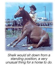 Sheik was named after Handrick's Sheik, Johnny's first bridleless trick horse. Johnny was just 13 years old when he trained Handrick's Sheik. Al-Marah Majestic Sheik was buried next to Handrick's Sheik on the farm owned by Johnny's father in nearby Covington, PA. "I traveled with Sheik for over a dozen years," Johnny said, "and I took care of him every day for over twenty years. Not a day will go by for a long time to come that I won't miss him. He was my friend."