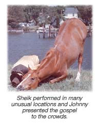 Known as "Johnny and the Sheik," the pair traveled across the U.S. and Canada, performing at exhibitions, horse shows, rodeos, and fairs. They also tackled movie stunts, appeared on many television shows, and were the subject of countless articles in magazines such as Horse & Rider, Arabian Horse Journal, Nashville Magazine, and Christian Life. Johnny estimates that Sheik made over one thousand personal appearances during his lifetime.